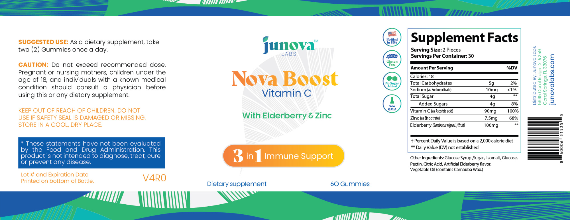 Nova Boost is a 3 in 1 Immune defense formula crafted with Vitamin C, Elderberry & Zinc for both adults and kids. Elderberry is well known for its high levels of powerful natural antioxidants in the form of phenolic acids, flavonoid and anthocyanins. Vitamin C can promote healthy skin and protect collagen and elastin of the human skin and Zinc promotes the formation of connective tissues which when combined is a potent combination in maintaining skin care health. With this immune powerhouse formula the entire family will be better equipped to resist any colds, viruses, infections etc