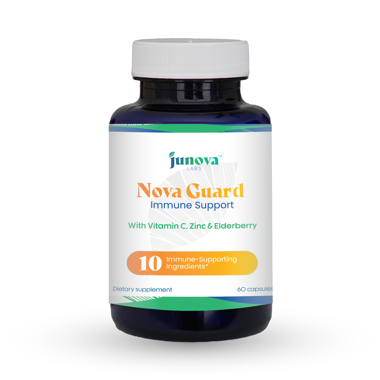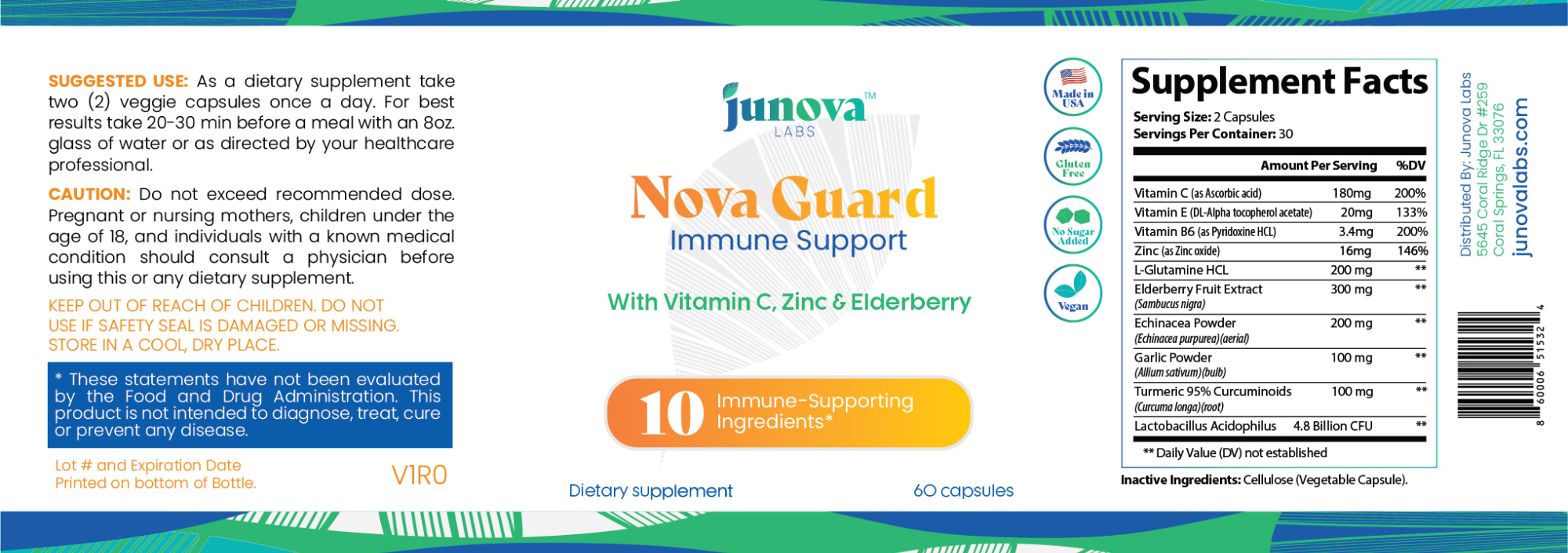 Nova Guard (Immune) has a concentration of 1000 mg and contains 4.8 billion CFU ensuring maximum retention and probiotic support. Containing a rich blend of 10 powerful vitamins and minerals, these capsules help strengthen the body’s natural defense systems and antioxidant support through the formula. Our supplement is made with high quality natural ingredients from elderberry fruit extract, vitamin C, E with B6, zinc, turmeric, echinacea and garlic powder